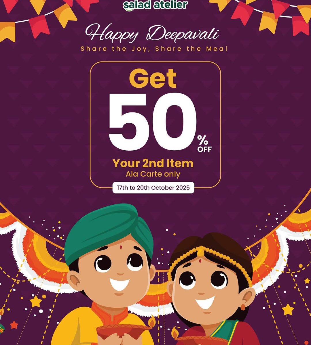 🪔 From all of us at Salad Atelier, Happy Deepavali to you and your loved ones. Let the celebrations begin, and don’t forget to bring a friend for that 50% treat!